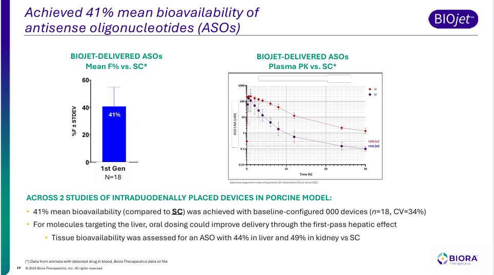 현재 Ionis-Biora의 공동연구에 대해 어떤 표적을 대상으로 하는지에 대해서는 알려진 바가 없지만 Biora Therapeutics가 올해 11월에 발표한 기업 소개자료에 1세대 Antisense Oligonucleotide에 대한 결과를 발표한 바가 있습니다.