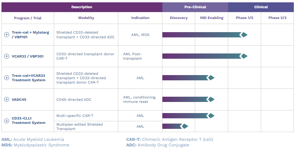 “Vor Bio expects to announce updated clinical data from the Phase 1/2 VBP301 trial of VCAR33ALLO in the first half of 2025 and updated clinical data from the Phase 1/2a VBP101 trial of trem-cel in combination with Mylotarg in the second half of 2025.”