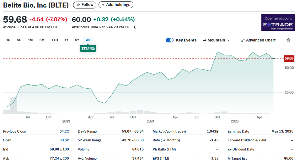 4위는 Belite Bio (BLTE)였습니다. 2022년 당시 주가는 $30.79였고 기업가치는 $0.77 Billion이었습니다.
