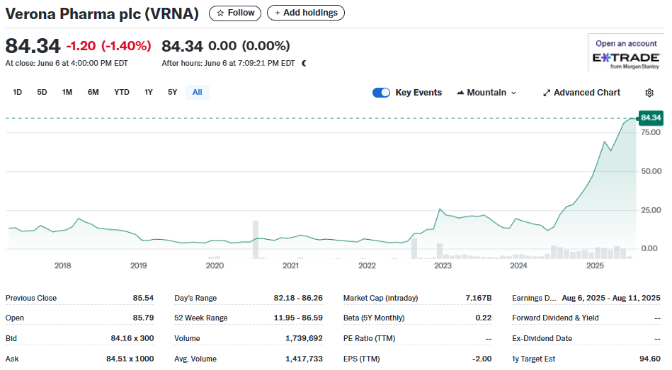 당시 1위는 Verona Pharma PLC (ticker: VRNA)였는데요 1년간 주식상승률이 241%였고 기업가치가 $1.87 Billion 주가는 $24.79였습니다.