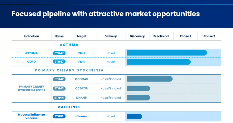 현재 Ethris의 pipeline은 아래와 같습니다. 현재 ETH47이 천식 (Asthma) 환자를 대상으로 임상2상을 진행 중이고 COPD 환자를 대상으로 임상 1상을 진행 중입니다.