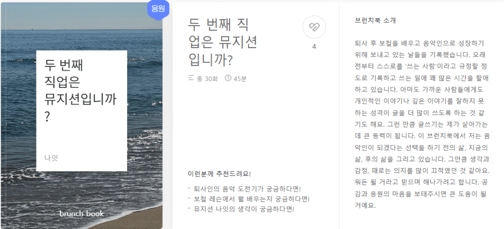 나잇이라고 마케팅 업무로 5년간 일을 하다가 퇴사하고 뮤지션으로 새로 시작한 이야기를 브런치북으로 쓰신 나잇이라는 분이 계십니다. 이 블로그도 도움이 될 것 같아서 올려 놓습니다.