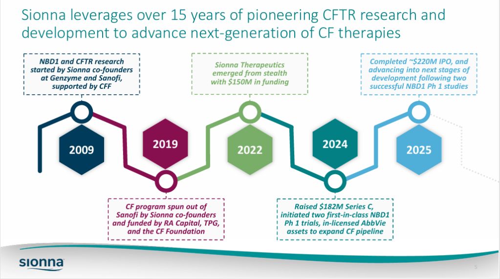 2009년-2019년까지의 Sanofi/Genzyme 연구 결실을 바탕으로 2019년에 설립된 Sionna Therapeutics는 2022년 Series B와 2024년 Series C를 한 이래 2025년에 나스닥에 상장되었습니다.
