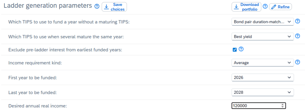 이 사이트의 “Generate”에서 원하는 금액을 넣어주면 됩니다. 예를 들어 매년 $120K 씩 받을 수 있는 TIPS ladder를 찾는 경우에는 이렇게 만들고요.