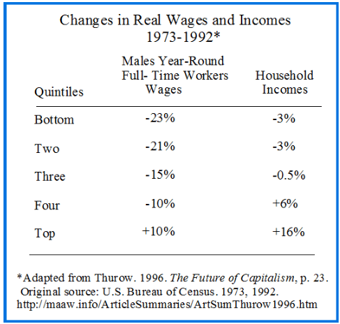 이 표는 큰 충격을 주었습니다. 20년간 오로지 상위층만이 연봉 상승을 겪었고 나머지는 모두 하락을 했습니다. 특히 Three라고 하는 부분이 아마도 중위그룹일 것 같은데 15%나 임금이 감소했습니다. 결국 상위층만을 제외하면 가난해 지는 것이 당연하다는 것을 이 통계가 증명하고 있습니다.