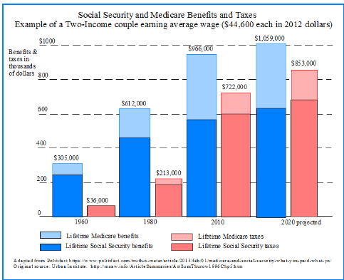 사회보장연금과 메디케어라는 65세 이상 의료보험의 혜택이 1980년까지는 낸 것에 비해 훨씬 더 많이 받았다면 2010년경부터 내야 하는 세금이 급격히 올라가는 것을 볼 수 있죠. 다행히 낸 것보다는 여전히 받는 것이 조금 더 많기는 합니다.