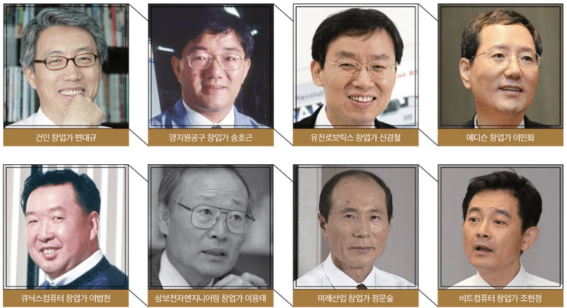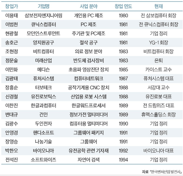 바이오니아의 박한오 대표도 생명공학연구소에서 창업해서 지금까지 살아남은 벤처1세대이시죠. 작고하신 정문술 미래산업 대표께서는 스타트업 육성을 위해 KAIST 등에 거액의 기부를 하신 분이시기도 하십니다. 얼마나 힘드셨는지 자살직전까지 농약을 먹고 죽으려고 했다는 일화도 있습니다. 그리고 이민화 메디슨 대표가 있으셨고 이 분들은 스타트업 뿐만 아니라 코스닥 상장 후 벤처캐피탈 회사를 만들어서 자기들만이 아닌 후배 기업들을 키워냅니다. 지금은 없어졌지만 무한창업투자가 있었고 삼보창업투자가 있었고 동원창업투자, KTB, 한국기술투자 등 메이저 벤처캐피탈 들이 있어서 스타트업 육성을 도왔죠.