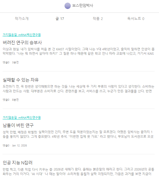 저의 브런치 스토리는 “보스턴임박사“입니다. 제 블로그 제목이기도 하지만 한인 과학자 분들과 만나면 모두들 저를 임박사라고 부르고 서식지가 보스턴이다 보니 자연스럽게 “보스턴임박사”가 제 부캐가 되었습니다. 커리어 관련한 책 4권, 소설 1권, 슈퍼에이징 연구관련 1권 이렇게 총 6권을 쓰려고 하고 있습니다. 지난 3년여간 보스턴임박사 블로그에서 700편이 넘는 글을 꾸준히 쓴 게 제가 이렇게 자신있게 브런치북 6권을 동시에 쓸 수 있다는 자신감을 심어준 계기가 되었습니다. 역시 블로그의 힘은 큰 것 같습니다. 브런치북은 사실 우연히 시작을 했는데 블로그는 마치 일기를 쓰듯이 써왔다면 브런치북은 보다 더 정형화된 출판의 느낌이 들고요. 제가 평생 함께 가려고 생각하는 2030 바이오텍 연구원들에게 하고 싶은 말들을 모아서 책으로 드려야겠다. 이런 생각도 담고 있어요. 요즘은 사실 Reverse Mentoring 시대이거든요. 지금 한참 배우시는 분들께 저같은 낡은 생각을 가진 이들이 되려 배워야 하는 세상이에요.