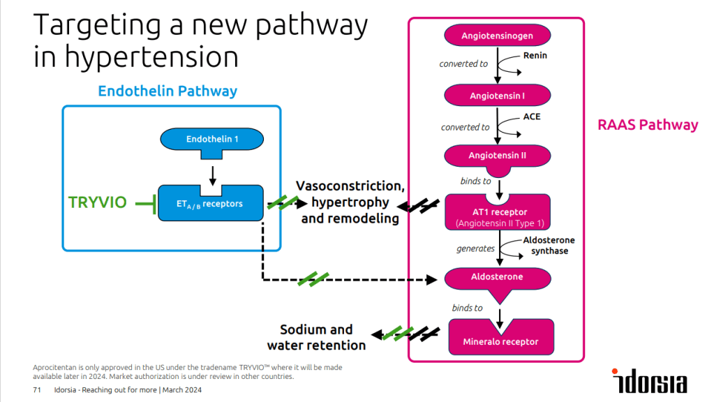 Designed to be orally available, Tryvio is a small molecule drug that works by preventing the binding of the endothelin-1 ligand to its corresponding receptors. This mechanism of action dampens signaling cascades that bear many similarities with pathophysiology of hypertension, according to Idorsia’s announcement.