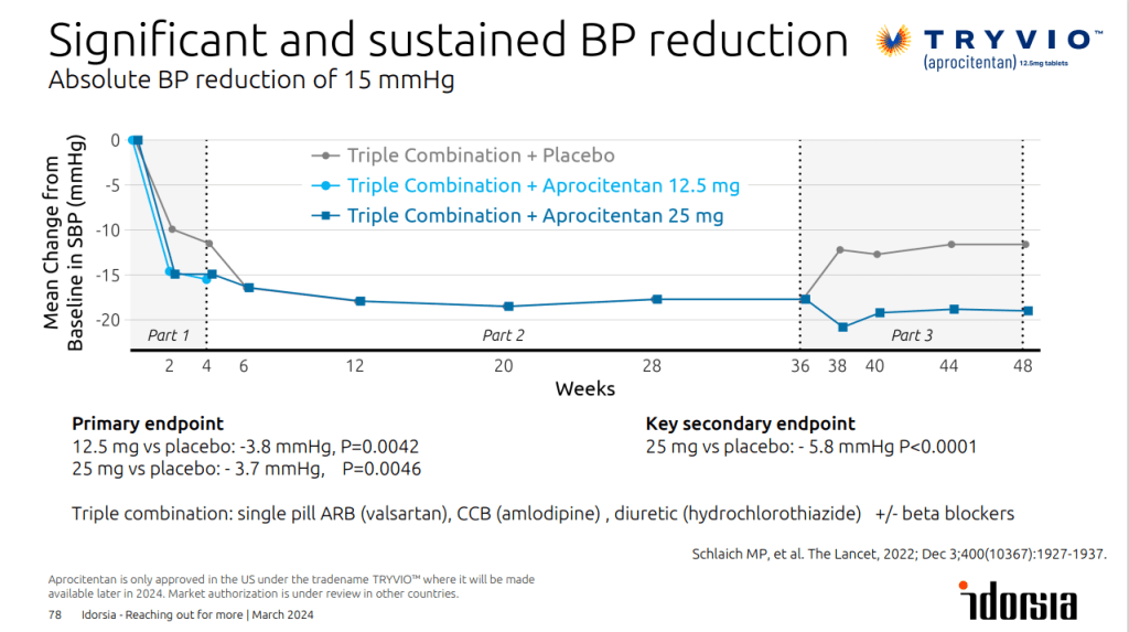 Idorsia backed Tryvio’s regulatory bid with data from the Phase III PRECISION trial, which enrolled 730 patients who had systolic blood pressure (SBP) of at least 140 mmHg and who were taking at least three antihypertensive drugs. Before treatment, all patients were switched to a standard background regimen consisting of a calcium channel blocker, a diuretic and an angiotensin receptor blocker.