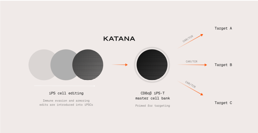 이 두 기술을 접목시켜서 Katana Platform을 만들었습니다. 회사의 간단한 설명에 의하면 induced Pluripotent Stem (iPS) Cell을 Editing해서 CD8ɑβ iPS-T master cell bank를 만들고 이것을 이용해 다양한 표적에 사용할 수 있다는 것입니다.