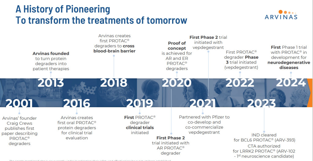 Arvinas는 Yale University Craig M. Crews 교수 연구실에서 개발한 PROTAC을 상용화 하기 위해 2013년에 New Haven, Connecticut에서 설립한 회사로 지금까지 10년간 Merck, Roche/Genentech, Pfizer, Bayer 등과 공동연구계약 및 VC/Crossover Funding을 통해서 성장한 회사이다.
