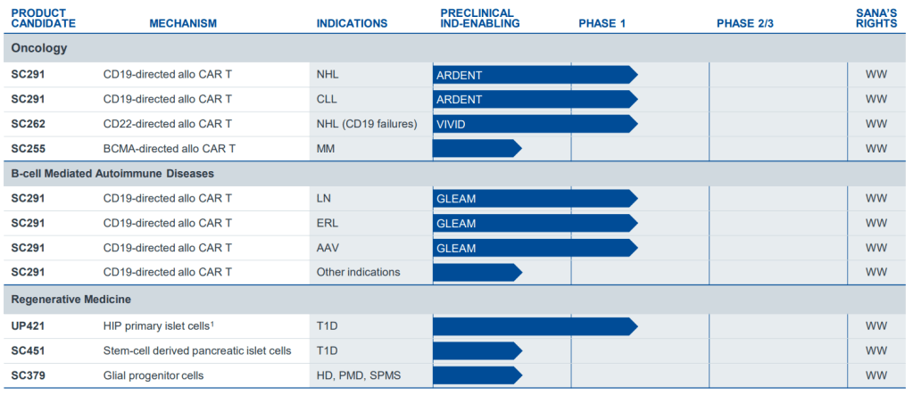 Sana Biotechnology가 2021년 2월에 Nasdaq IPO를 할 때 계획은 2022년에 Fusogen In Vivo Program인 SG295 (CD8/CD19)과 Ex Vivo Program인 SC291 (CD19)이 임상시험에 진입하는 것이었습니다. 하지만 계획과 달리 2022년말까지 한개도 임상시험에 진입하지 못하면서 결국 15% 구조조정을 하게 됩니다. 이 당시에 포기하는 프로그램은 Cardiomyocytes Ex Vivo Program인 SC187만 중단하는 것이었습니다.