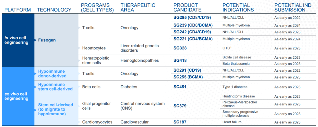 Sana Biotechnology가 2021년 2월에 Nasdaq IPO할 당시에 제시한 파이프라인에서 Fusogen In Vivo Platform은 전체 파이프라인의 절반에 해당했을 뿐만 아니라 ex vivo program보다 앞에 내세워질 만큼 경영진의 피치에서 중요한 부분이었습니다.