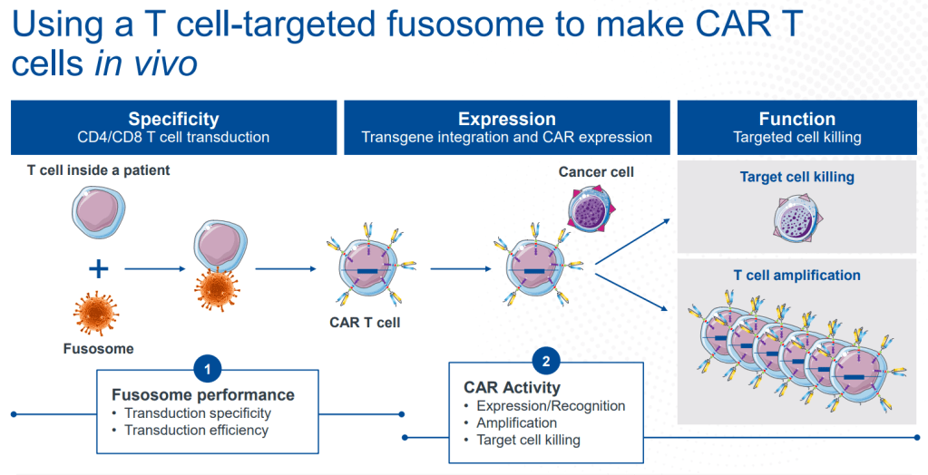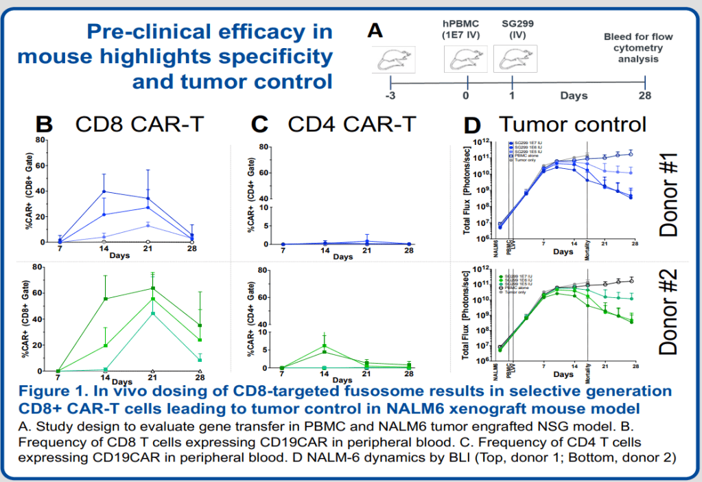 Preclinical data demonstrate that CD19 CAR T cells generated in vivo by transduction of T cells with CD8-targeted fusosomes have anti-tumor efficacy comparable to ex vivo generated CAR T cells.