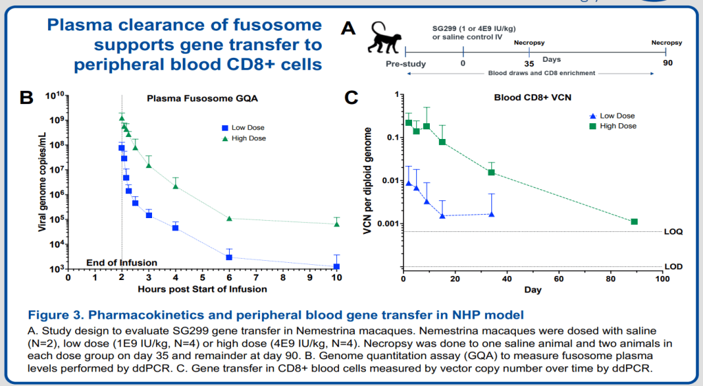 NHP PK를 봤을 때 plasma에서는 High dose의 경우 Fusogen이 10시간 이상 잔류하였고 CD8+는 100일 (3개월)까지도 유지되었습니다.