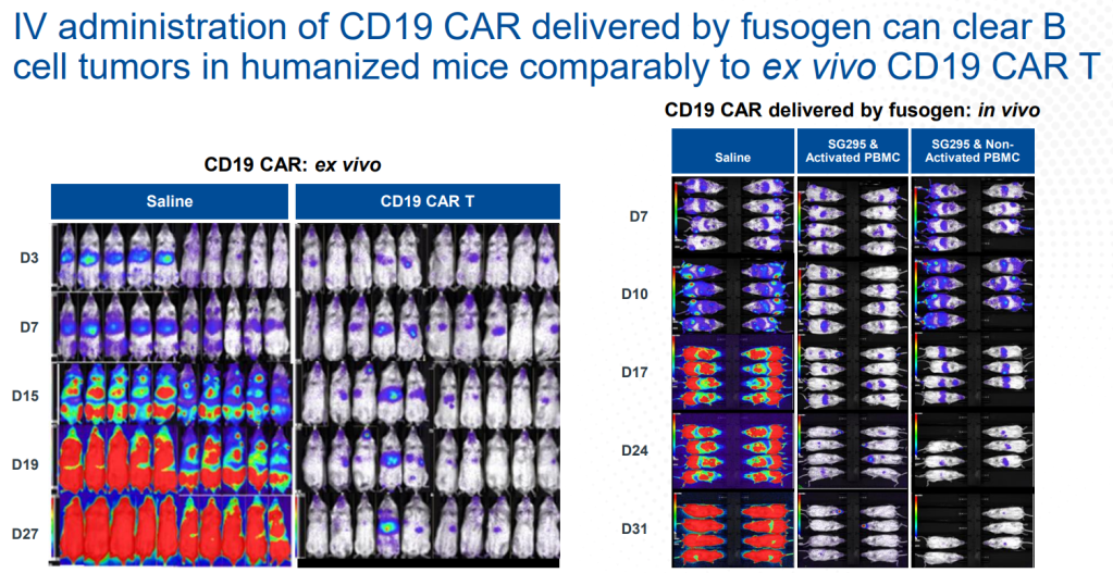 그리고 Humanized mouse model에서 ex Vivo CD19 CAR-T와 비교했을 때 Fusogen CD19 CAR-T가 B cell tumor를 사라지게 한 것이 확인된 바 있습니다. 이것이 Mouse PoC data였습니다.