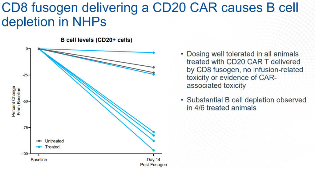 CD8/CD20 CAR-T를 Fusogen In Vivo Delivery 한 NHP 시험에서도 B cell depletion을 볼 수 있었습니다.